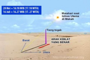 10. Tetapi bagaimana jika lokasi kita berada di daerah WIT yang tentu saja matahari telah terbenam ketika peristiwa itu berlangsung? Jangan khawatir, masih ada kesempatan untuk melakukan pengukuran yakni pada tanggal 28 November pukul 00.09 waktu Arab atau 06.09 WIT dan peristiwa yang sama akan terulang pada tanggal 17 Januari pukul 00.29 waktu Arab atau 06.29 WIT. Karena pada waktu tersebut matahari terletak di antipode atau nadir (tepat berada di bawah ka’bah).